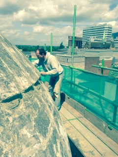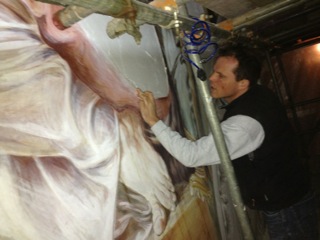Jim Smith is the best plasterer you will ever find. He has a way of making very difficult jobs seem very easy; he did all the plastering for the two big frescos I did in Bedford, and without him, those frescos would not have got done. No matter how awkward the size or shape of the piece, or how many edges, or how much scaffolding was in the way, his intonaco layer – the final layer, the one which accepts pigment – was perfectly fitted to the surrounding parts and absolutely smooth, while necessarily being less than 1.5mm thick. Anyone who can carry out that kind of detailed, precise work in a howling gale while being pelted with rain 30 feet above the ground can do any kind of plastering work, no question about it!